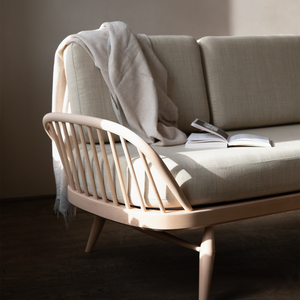 Equal parts beautiful and functional, this versatile piece features traditional spindle details and a simple, ergonomic backrest fashioned from a singular piece of carved wood. An arched, steam-bent ash rod stabilizes the armrests and webbing adds strength and support to the settee’s frame.